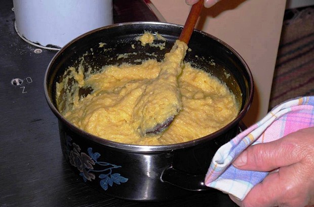 Kad ponovo prokuha smanjiti temperaturu, sipati kukuruzno brašno i neprekidno miješati da polako krčka 10-ak minuta.