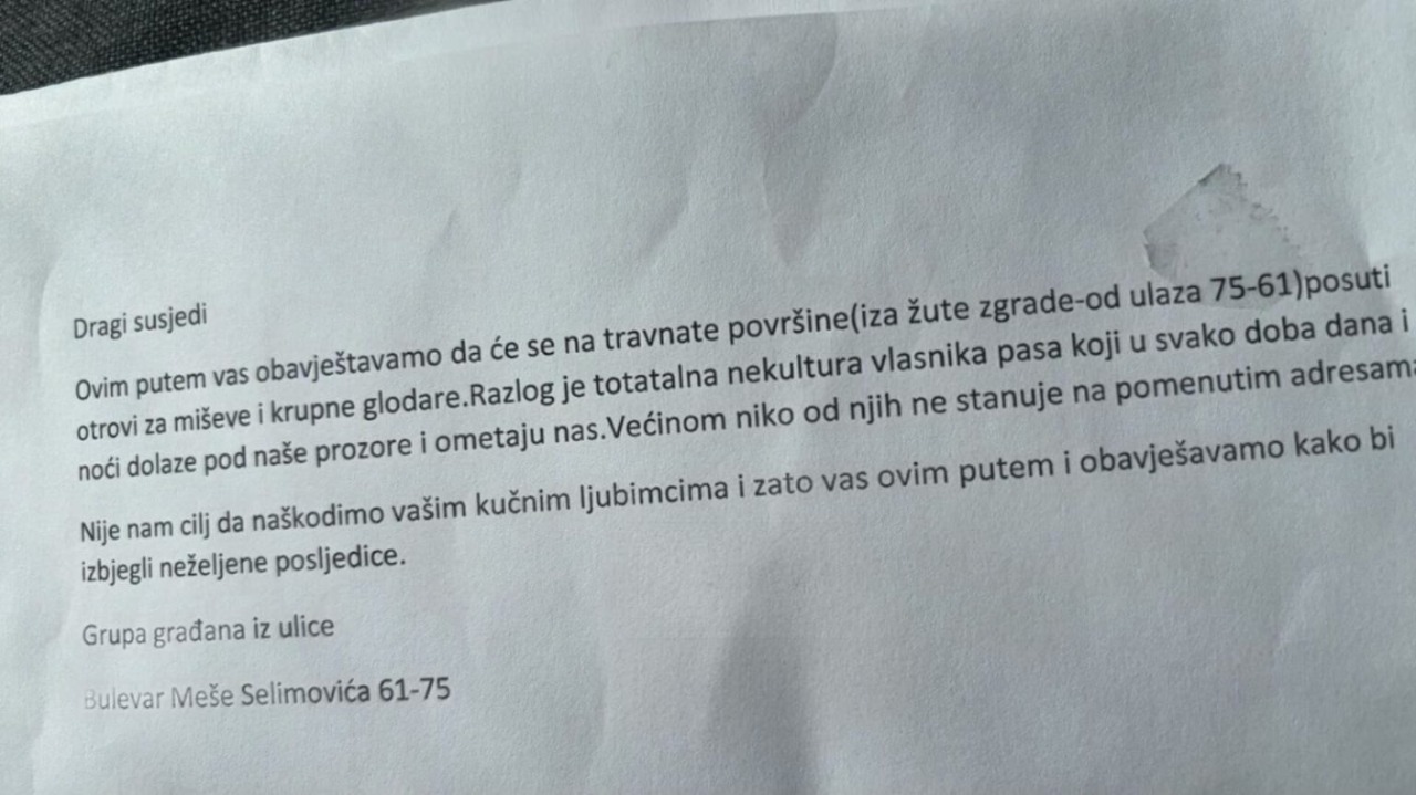 Stanari naselja u ulici Bulevar Meše Selimovića u Sarajevu oglasili su se javno nakon što je jedna od komšinica primila anonimno pismo sa prijetnjom da će na javnoj zelenoj površini biti posut otrov. Radi se o prostoru između zgrada broj 61–75, uz obalu Miljacke, koji svakodnevno koriste djeca, stariji građani i vlasnici kućnih ljubimaca.