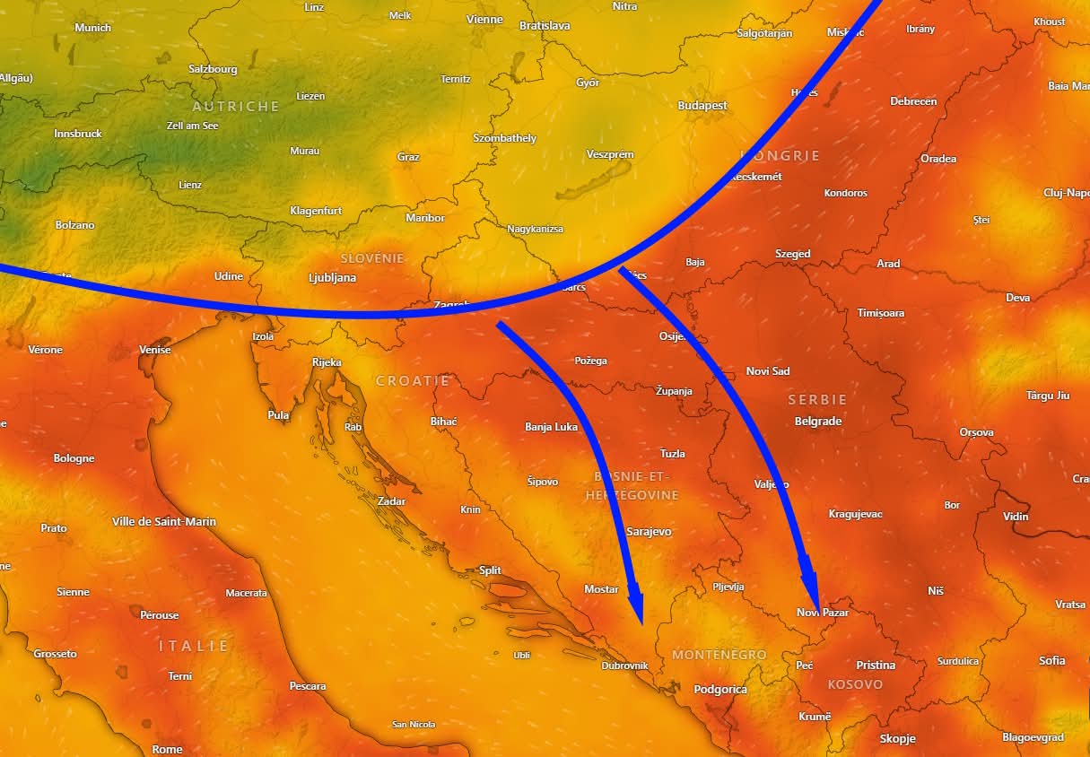 Uz njen dolazak, očekuje se prolazno jak sjeverac – u pojedinim dijelovima i olujne jačine – koji će vrlo brzo rashladiti vruću podlogu. Taj vjetar bi mogao početi jačati već oko 20h, posebno u sjevernim dijelovima zemlje.