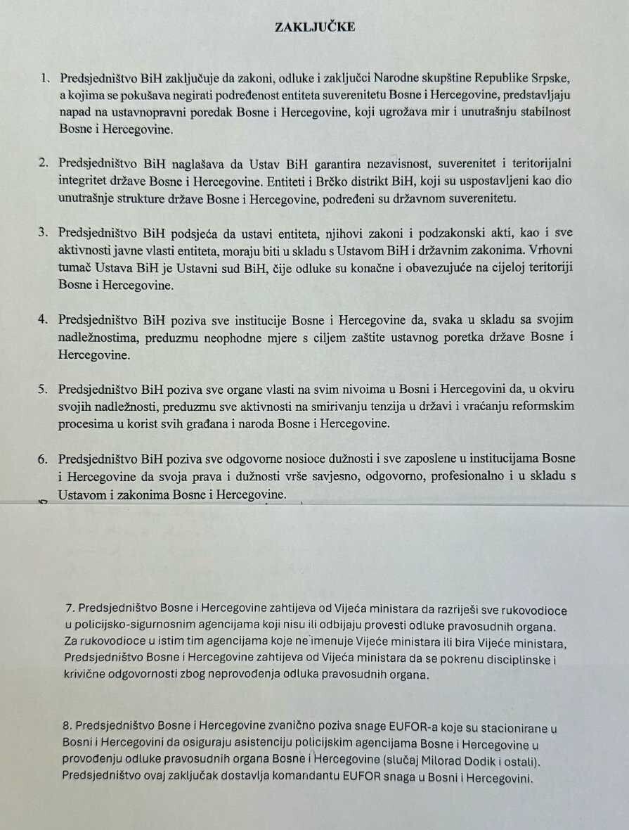 Naime, posljednja tačka zaključaka koje su predložili Denis Bećirović i Željko Komšić odnosi se na zahtjev EUFOR-u da asistira prilikom hapšenja rukovodstva Republike Srpske, za kojim je pokrenuta potjernica.”Predsjedništvo Bosne i Hercegovine zvanično poziva snage EUFOR-a koje su stacionirane u BiH da osiguraju asistenciju policijskim agencijama BiH u provođenju odluke pravosudnih organa BiH (slučaj Milorad Dodik i ostali). Predsjedništvo ovaj zaključak dostavlja komandantu EUFOR snaga u BiH”, navodi se u zaključku.