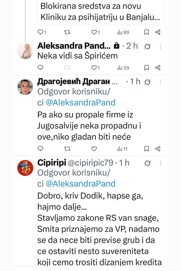 To je rezultat Dodikove politike guranja prsta u oko. Vozi sa sobom u ambis čitavu zemlju i narod. Nažalost, narod će platiti, a ne oni, poručila je Pandurević.