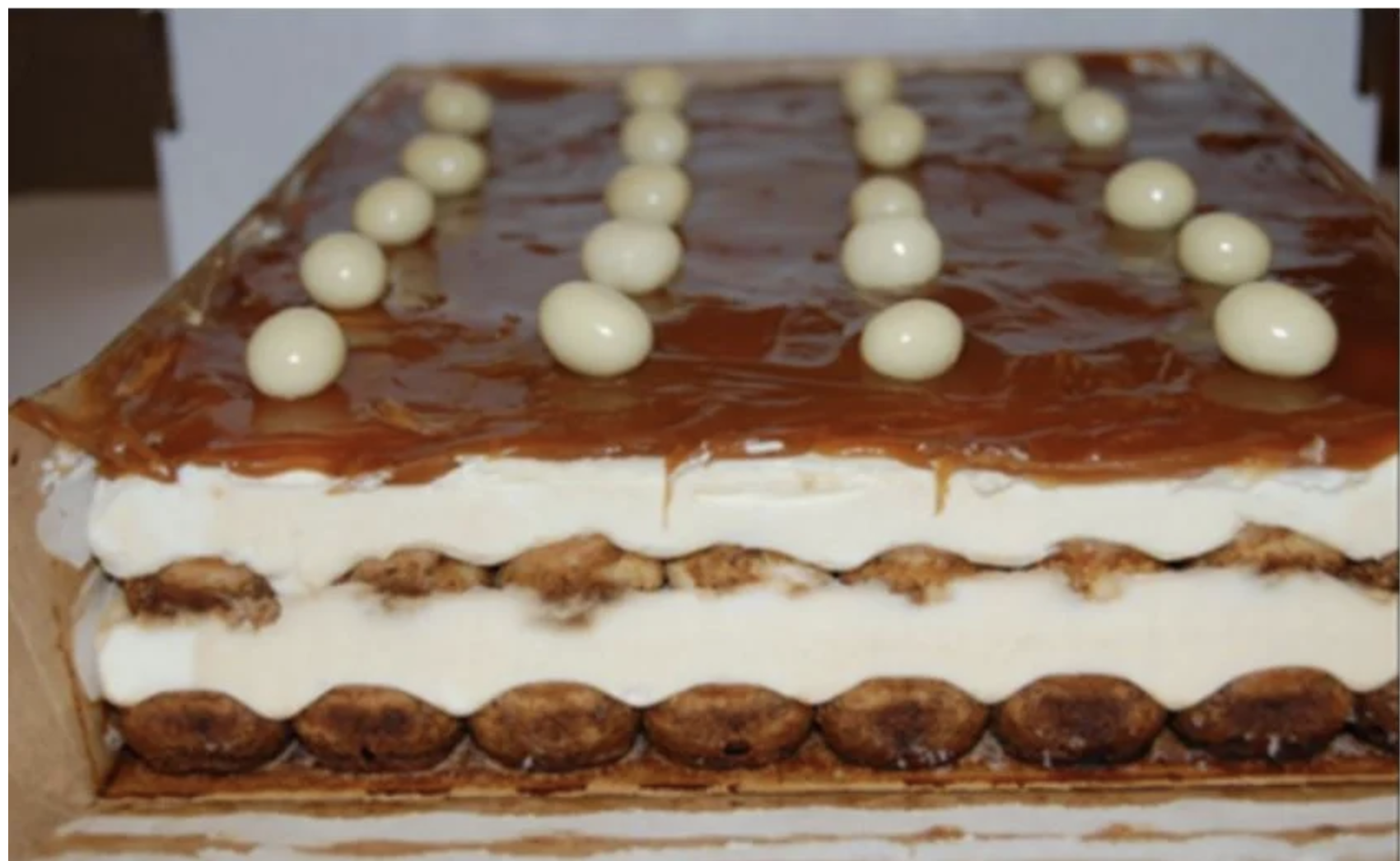 5.U posudu za Tiramisu staviti par kašika kreme, pa na nju slagati piškote, provlačeći ih prvo kroz preliv sa nes kafom. Složene piškote premazati kremom, pa na kremu složiti još jedan red piškota. Ostatak kreme staviti na piškote, zagladiti kremu da se lepo poravna, pa staviti u frižider.