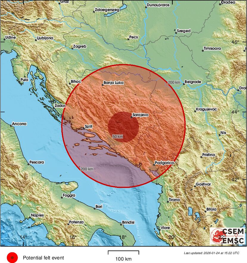 Evropsko-mediteranski seizmološki centar (EMSC) objavio je informaciju o mogućem zemljotresu u Bosni i Hercegovini, zasnovanu isključivo na prijavama građana. Prema navodima korisnika iz Mostara i okolnih mjesta, osjetilo se kratkotrajno podrhtavanje tla.