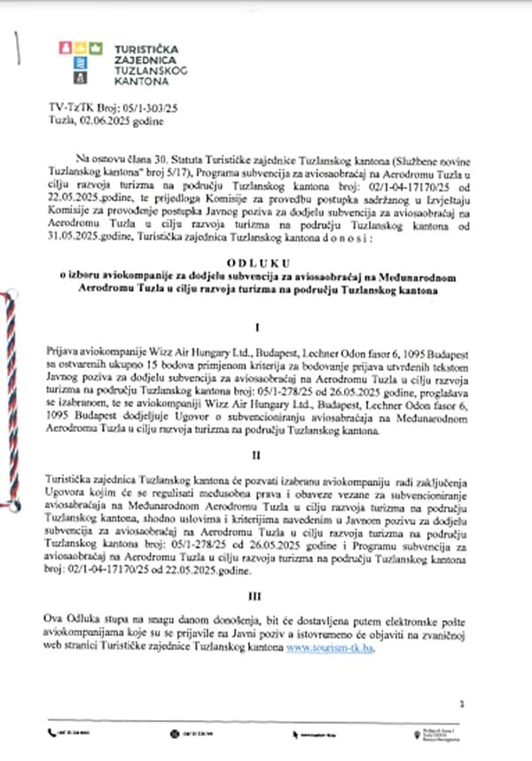 Navodi se da će Turistička zajednica TK sada pozvati izabranu aviokompaniju radi zaključenja ugovora, kojim će se regulirati prava i obavaze.